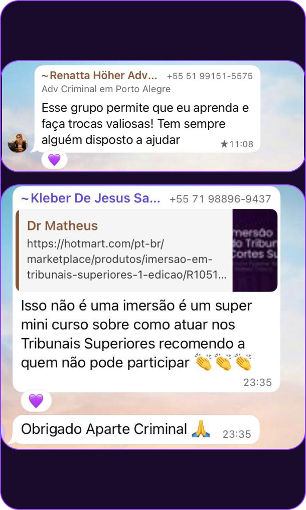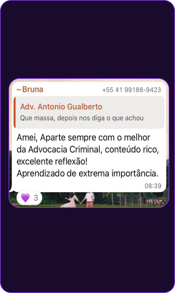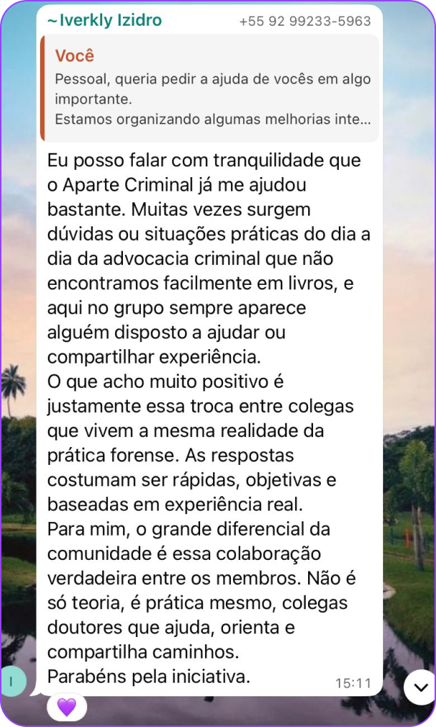 O Aparte Criminal é a comunidade que entrega o que cursos caros prometem e não cumprem: conteúdo prático sobre advocacia criminal e tribunais superiores, com atenção real a cada membro.